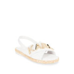 A woven vamp enhances the laid-back appeal of an easy-wear slide sandal grounded by a flat sole.