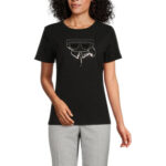 Cut from a soft stretch cotton fabric, Karl Lagerfeld Paris updates a classic tee with ruching at the sleeves and a goldtone metallic logo at the center.