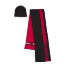 Designed by Tommy Hilfiger, this coordinated cold-weather set includes a striped knit hat, matching scarf, and gloves, offering a cohesive finish to seasonal looks.